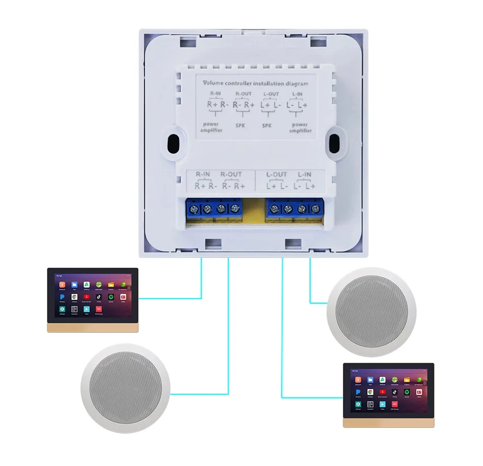 This source input volume control with 5 step suitable for all our wall mount amplifier. It provides easy control of the smart home audio. Multi Home Audio System Dual channels, support stereo audio adjustment can control two pieces of speakers simultaneously.
