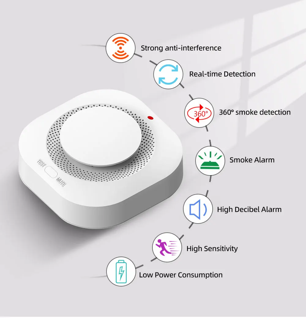 Mute: In smoke alarm status, press the button “Test” to mute the alarm with LED light blinking alone.