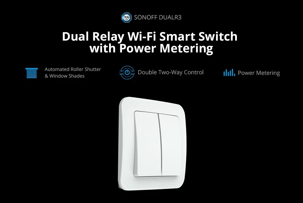 SONOFF DUALR3 takes your home to the next level. DUALR3 is a flush-mounted Wi-Fi smart dual relay switch module that is installed behind any standard switch to transfer it into a smart switch for wireless remote control with mobile devices or voice command. Unifying your home appliances into an integrated wireless network to make them communicate with one another which is convenient for you to manage and control, including lights, home appliances and motorized facilities like roller shutters, window shades, blinds, awning, etc
