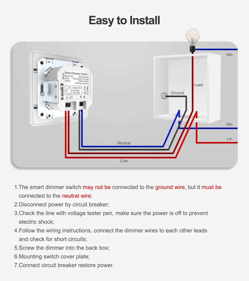 5.Neutral wire is required in your switch boxes to operate correctly; only supports 2.4 GHz network.